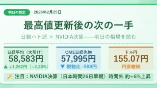明日の想定(2026年2月25日)本日(2月25日)の日本市場は、日経平均が58,583円(前日比+1,262円・+2.20%)で大引けた。 日銀審議委員候補の人事案が市場に伝わり、利上げ観測が急速に後退したことが相場を動かした主因だ。 一...