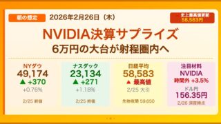 本日(2026年2月26日)の日本市場は、日経平均が58,753円(前日比+170円・+0.29%)で大引けた。NVIDIA決算を前に押し目買いが入り、朝方から堅調に推移した。一方で、高値圏では6万円の大台手前の利益確定売りが上値を抑え、5...