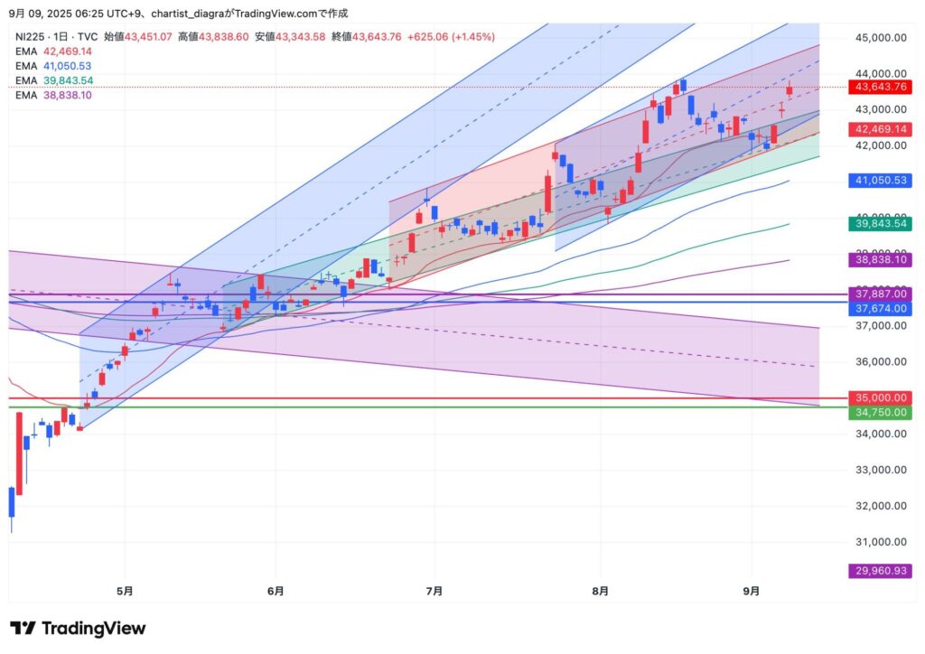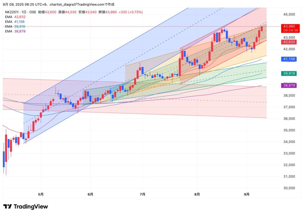 夜間先物取引は高値44030円を付けて現物より一足先にざら場ベースでの史上最高値更新後、終値ベースでも43980円と高値更新となった。