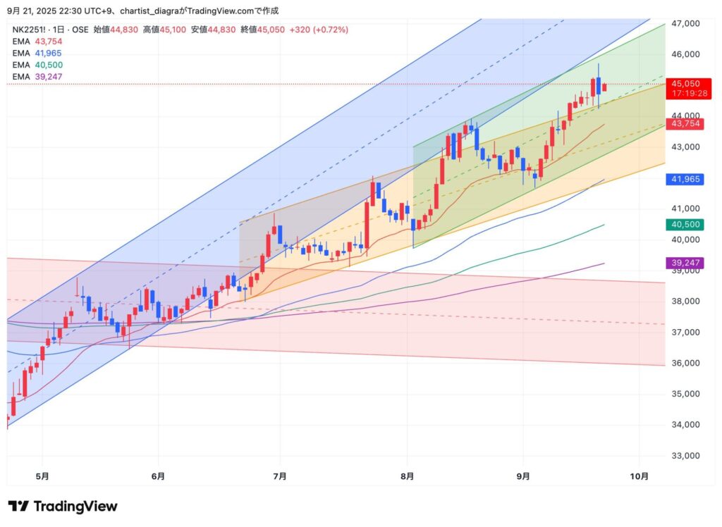 週末の夜間先物取引は44830円の安値から戻して結果は320円高、45050円と45000円台に戻してきた。