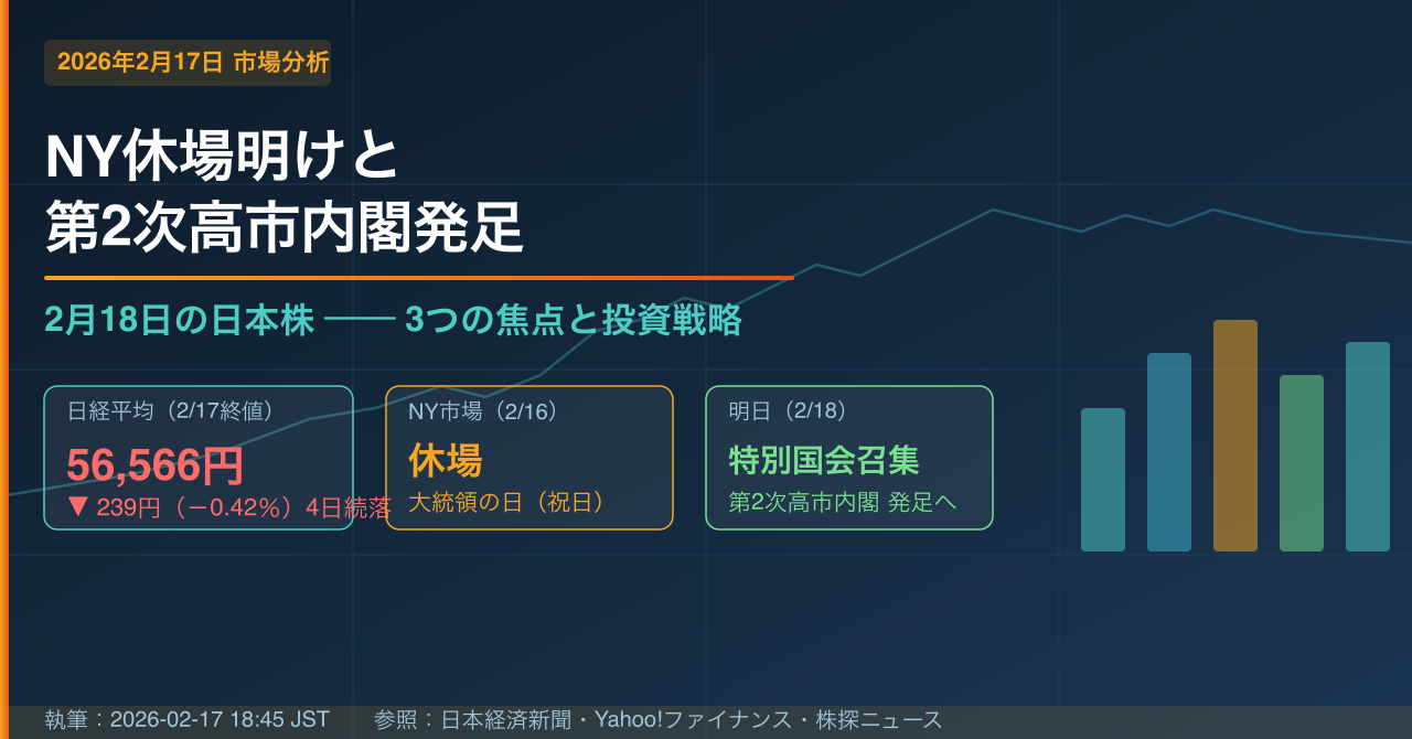 2026年2月17日(火)、東京株式市場の日経平均株価は前日比239円92銭安の5万6566円49銭で取引を終え、4日続落となりました。一時は650円超の下落を記録する場面もありましたが、取引終盤には下げ渋り、最悪の水準からは回復しました。明日2月18日は、今晩のNY市場が再開するとともに、第2次高市内閣の発足が見込まれる特別国会が召集されます。この二つの材料が明日の相場をどう動かすのか。本稿では今日の市場を振り返りながら、明日への投資判断に必要な情報を整理します。