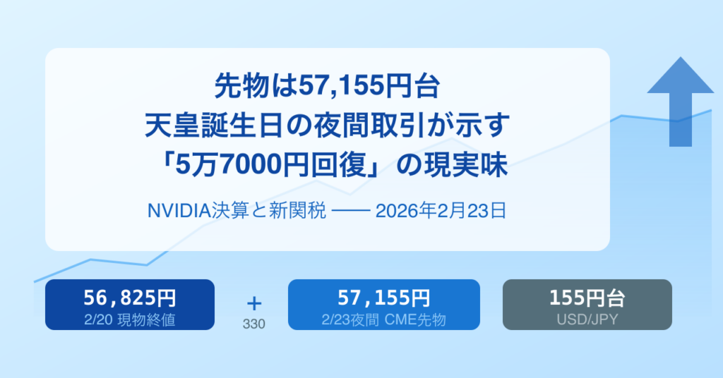 2月20日の現物終値(56,825円)から一夜明け、2月21日(土)の夜間取引終了時点では57,130円(前日比+290円)まで回復していました(参照:日本経済新聞 先物夜間取引)。そして天皇誕生日となる2月23日(月)の現在、CME日経先物(ドル建て・NKD)は57,155USD水準(24時間比+0.18%)で取引されており、実質的な価格水準はほぼ変わらず「57,100〜57,200円」台での推移が続いています。