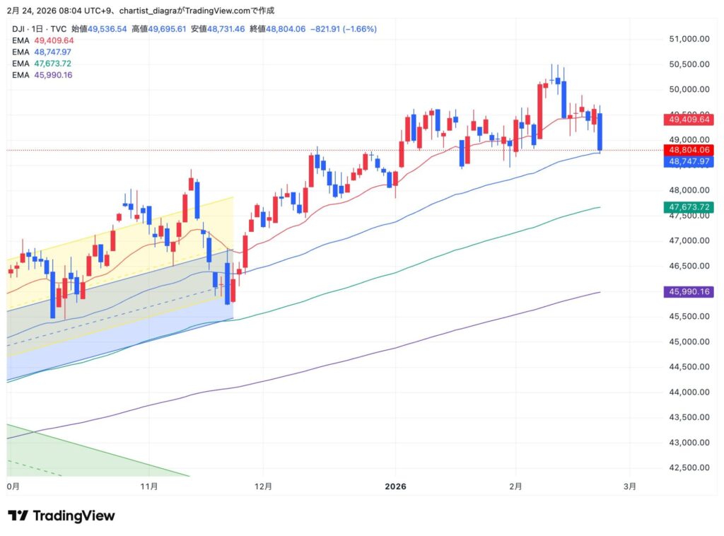 直前の2/20終値は49,625ドル(+231ドル、+0.47%)。トランプ関税を材料に一時下落したものの、「TACOトレード(Trump Always Chickens Out=最終的に妥協するという読み)」の記憶が根強く残る投資家心理が押し目買いを呼んだ格好だ。