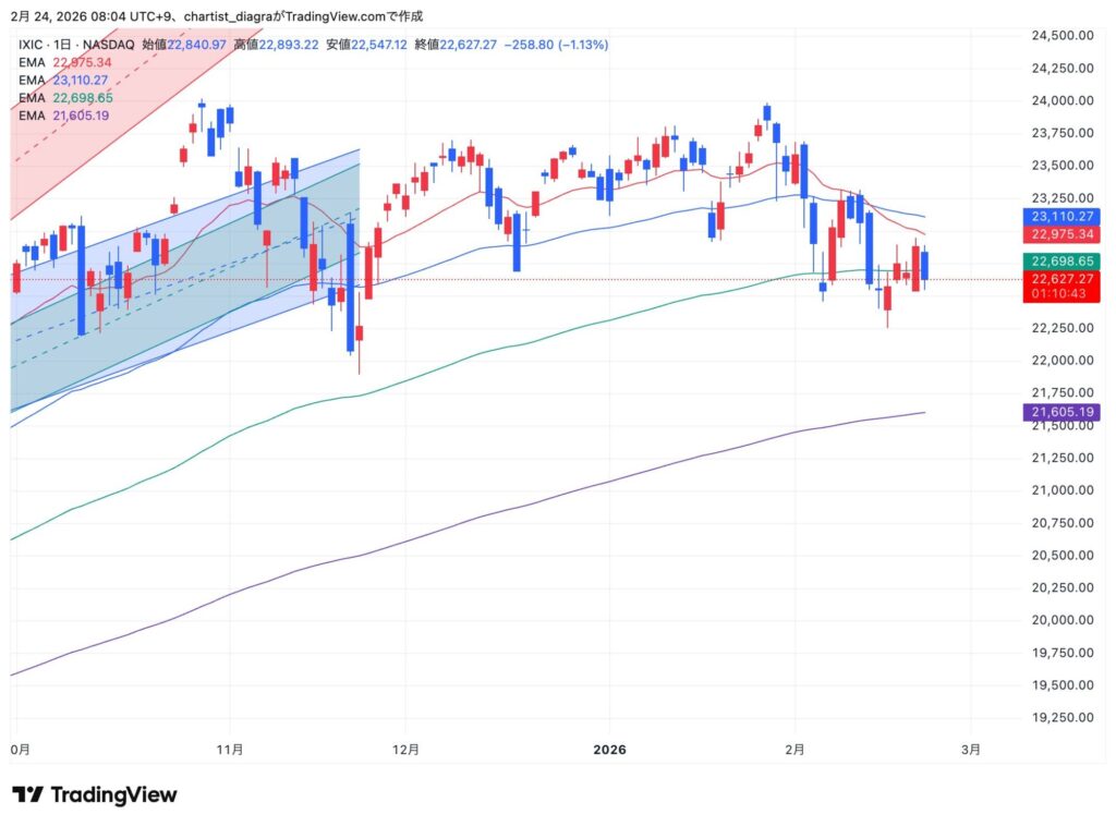 直近のNY市場(2/20金曜・現地終値)は、ダウ+0.47%・ナスダック+0.90%と揃って反発した。コアPCEがインフレ上振れを示し波乱含みで始まったものの、最高裁によるトランプ関税措置無効判断を好感した買いが入り、引けにかけて水準を切り上げた。一方で、トランプ大統領が「全世界向け10%一律追加関税」を表明したことで上値は重く、強気一色とは言い難い内容でもあった。本日(2/24)はこのNY終値を引き継いだ形で日本市場が再開する。
