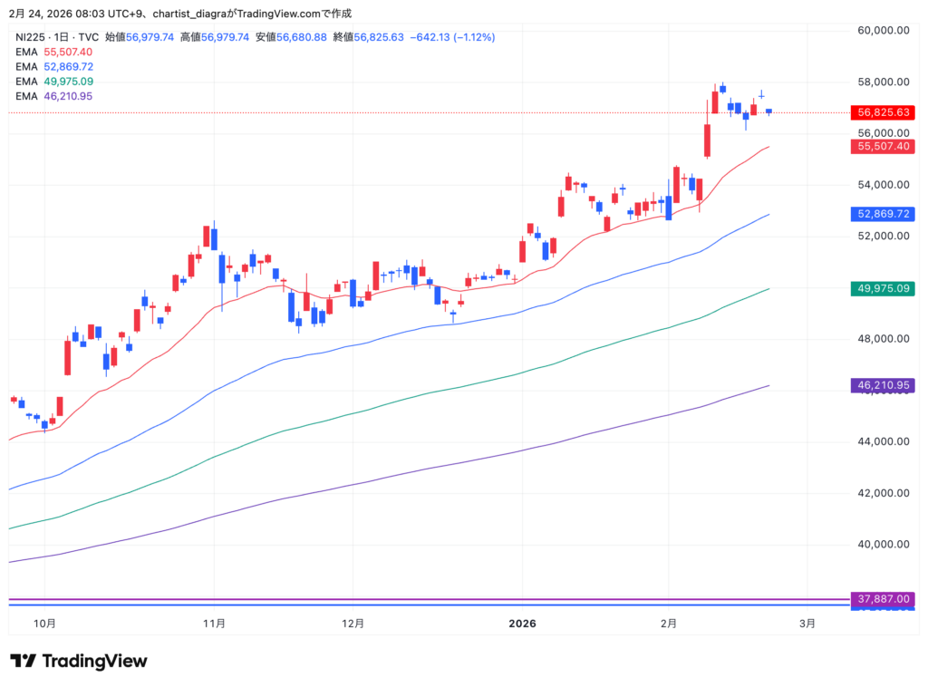2/20終値56,825円、CME先物は57,155円水準で夜間推移しており、本日の寄り付きは57,000〜57,200円台が有力だ。天皇誕生日をはさんだ3連休の間も先物が底堅く推移した事実は、買い意欲の維持を示している。