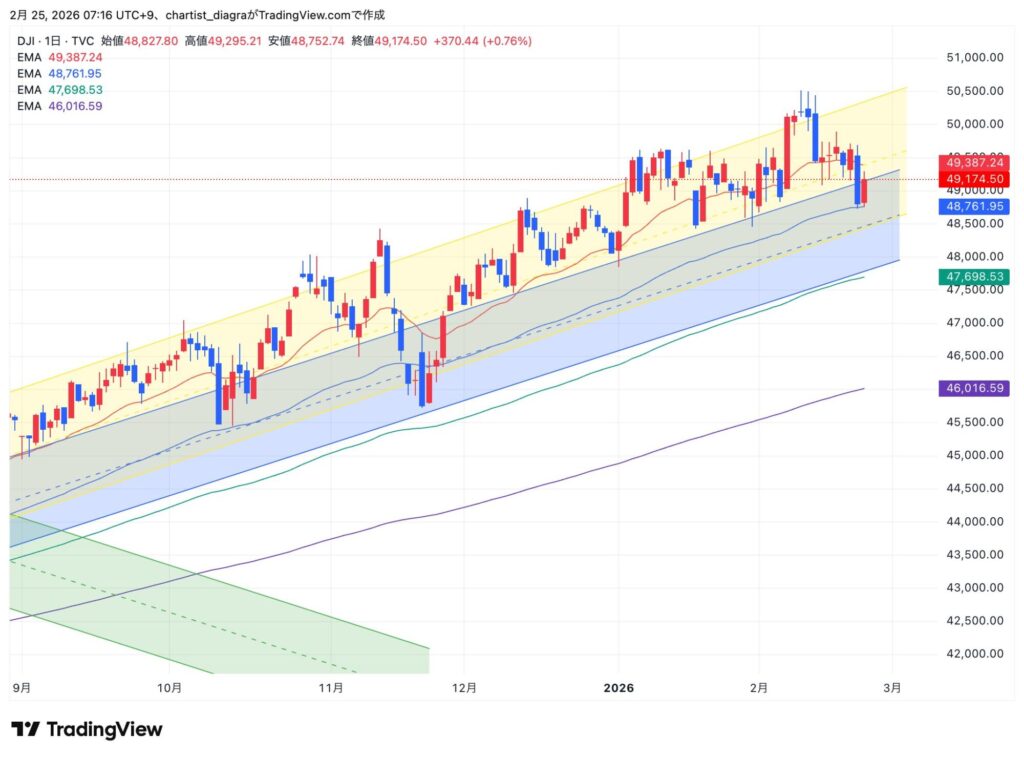 前日(2月24日・現地終値)は 49,174(+370.44・+0.76%)で引けた。