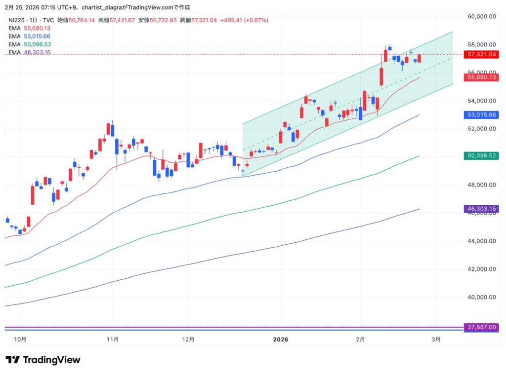 前日(2月24日・大引け)は 57,321円(+495円・+0.87%)。