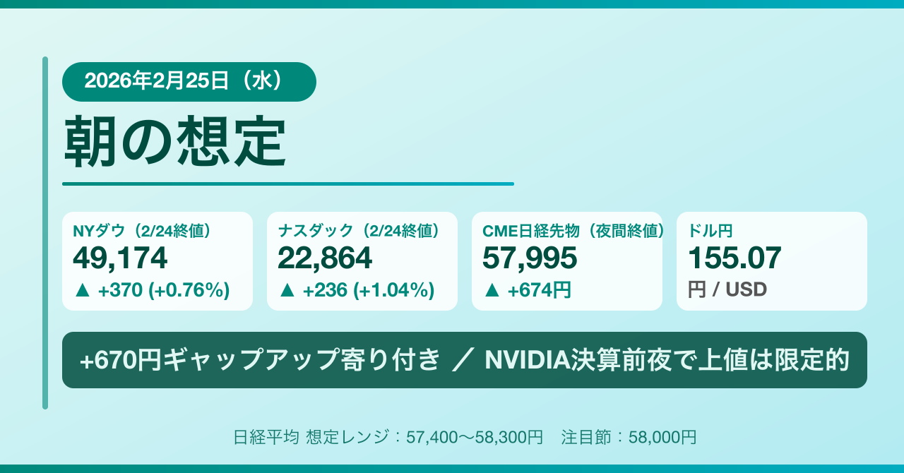 エヌビディア決算の結果は日本時間2月26日早朝(現地25日引け後)となるため、本日はその前夜として結果待ちの様相が強まるだろう。