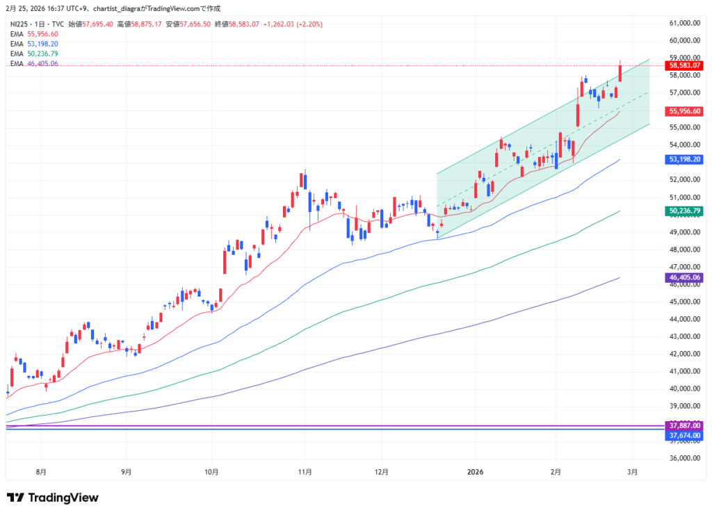 本日最高値を更新したことで上値抵抗は当面未知の領域となるが、切り返した際は59,000円台が次の意識されるゾーンとなろう。 下値支持としては、本日の節目水準である57,321円(前日終値)、さらに下では57,000円の心理的節目が挙げられる。 ドル円が円安方向(155円台維持〜156円方向)を保てば輸出関連・半導体への追い風となり、逆に円高方向(154円割れ)に振れれば輸出セクターへの重荷となる。