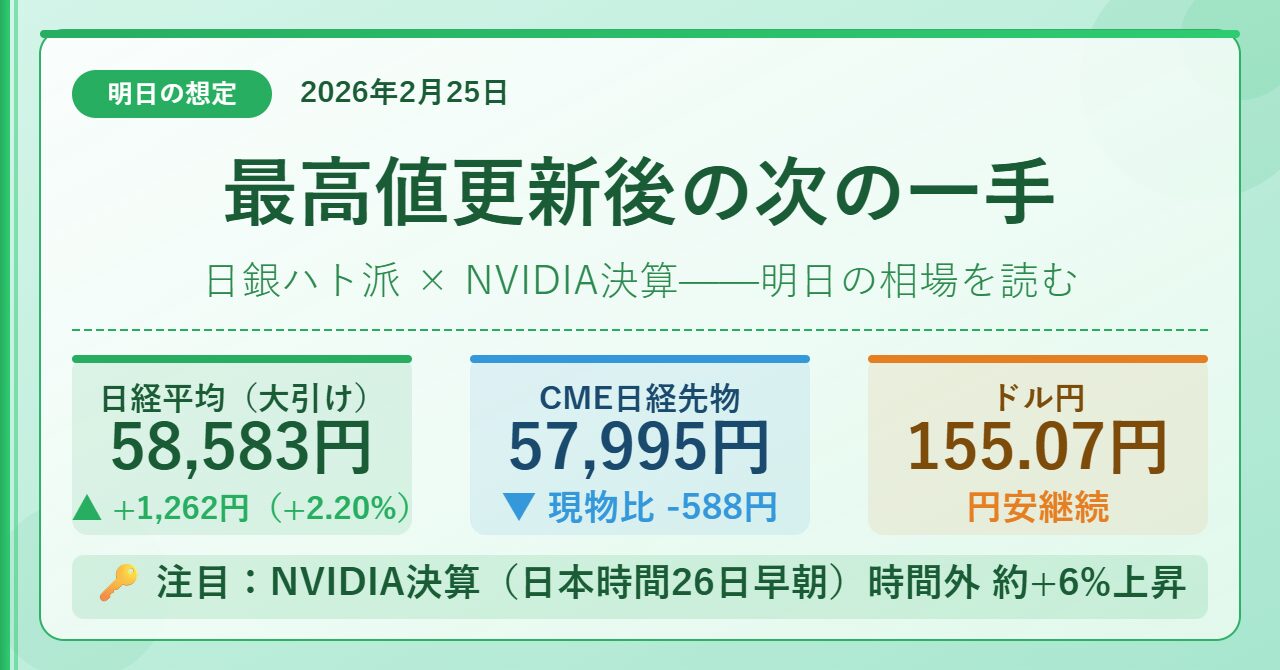 本日(2月25日)の日本市場は、日経平均が58,583円(前日比+1,262円・+2.20%)で大引けた。 日銀審議委員候補の人事案が市場に伝わり、利上げ観測が急速に後退したことが相場を動かした主因だ。 一方、中国による日本企業20社の輸出規制リスト追加を受けて銀行株・重工株には売りが出た。 NVIDIA決算(日本時間26日早朝発表)の結果次第では、明日の展開に一段の乗数効果が加わりそうだ。