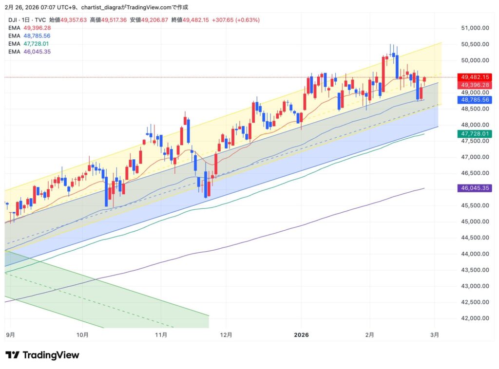 直近のNYダウ工業株30種(2月25日・現地終値)は、終値49,174.50ドル(前日比**+370.44ドル・+0.76%**)と続伸した。