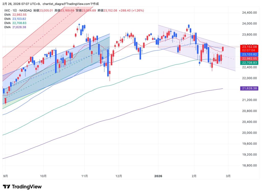 直近のNASDAQ総合指数(2月25日・現地終値)は、終値23,134.91(前日比**+271.23・+1.18%**)と大幅続伸した。