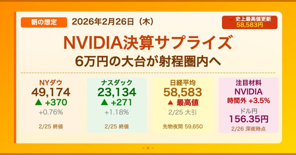 NVIDIA決算を受けた時間外上昇が東京時間の半導体株を直撃しやすく、日中の寄り付きは59,500〜59,700円近辺からのスタートが想定される。