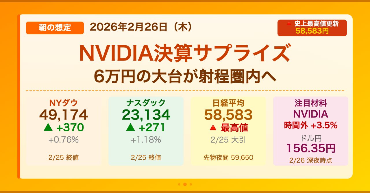 直近のNY市場(2月25日・現地終値)は、ダウ**+0.76%・ナスダック+1.18%**と続伸となった。