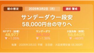 寄付き前 朝の想定(2026年3月2日) 2月27日(現地時間)のNY市場は、ダウが48,977ドル(前日比−521ドル・−1.05%)、ナスダックが22,668ポイント(同−210・−0.92%)と揃って反落した。イラン情勢の緊迫化を受けたリスク回避の売りが重く、日中の下げ幅は一... 2026.03.02 寄付き前指数米国ダウ米国ナスダック