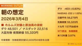 寄付き前 朝の想定(2026年3月4日) 3月3日(現地時間)のNY市場は、ダウ平均が**-0.83%(-403.51ドル)の48,501.27ドル**、ナスダック総合が**-1.02%(-232.17pt)の22,516.69**と、ともに続落で引けた。対イラン軍事作戦の長期化を... 2026.03.04 寄付き前指数米国ダウ米国ナスダック