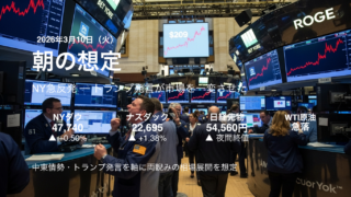 寄付き前 朝の想定(2026年3月10日) NY市場(3月9日・現地終値)は、ダウ+0.50%・ナスダック+1.38%と急反発で終えた。序盤は一時886ドル安まで売り込まれる場面もあったが、終盤にトランプ大統領が「イラン戦争はほぼ完全に終結している」と述べたことで局面が一変した。11... 2026.03.10 寄付き前指数米国ダウ米国ナスダック