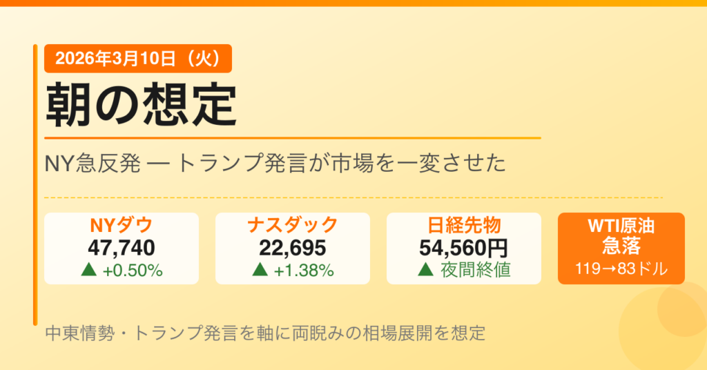 前日(3月9日・現地)のダウ平均は47,740.80ドル(前日比+239.25ドル、+0.50%)で引けた。