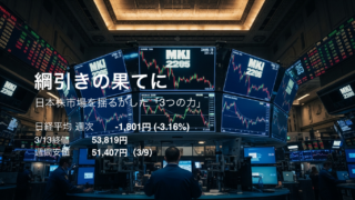今週の日経平均 綱引きの果てに──2026年3月第2週、日本株市場を揺るがした「3つの力」 執筆:2026年3月15日 20時49分2026年3月第2週(9日〜13日)の日本株市場は、原油価格の急騰と急反落、米国株の連鎖的な下落、そして円安の進行という「3つの力」が複雑に絡み合い、日経平均株価が週次で1,801円安(前週末比)とな... 2026.03.15 今週の日経平均指数